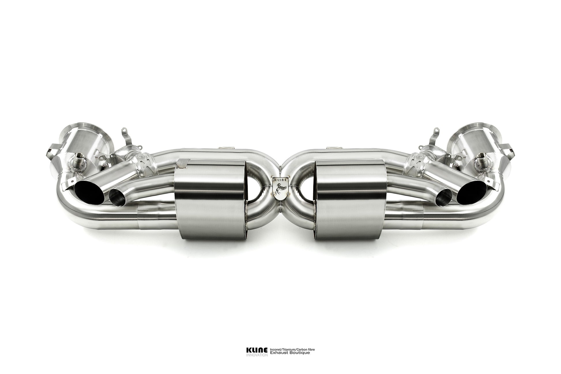 Removal of the heavy chambered rear silencer, and replacing it with a lightweight F1 grade Inconel 625 X pipe, and Fully bypassable lightweight Inconel silencers, sheds a significant amount of weight, as well as raising the pitch of the exhaust into a more exotic tonal range. Removal of the OPF and catalysts, and replacing them with either HJS motorsport catalysts, or De-cat pipes, opens the sound up significantly, complementing and accentuating the high pitched silencer section, into an exotic scream. The Kline innovation rear valvetronic setup, means that the car can be driven in stealth mode with the valves closed, however a raw unhindered sound can be achieved with valves open. Addition of our beautifully crafted F1 grade Pre Preg carbon fiber exhaust tips complemets the exhaust perfectly.