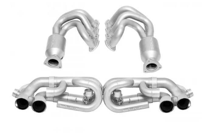Our 991.1 Carrera Valved Performance Exhaust System has been designed with the professional enthusiast in mind. With valves open exhaust gases are free to exit through a completely unrestricted path out the tips offering a flat six symphony with a tone that will raise the hairs on the back of your neck! On your way to pick up a client or heading out to dinner with someone special? Keep the valves in closed position and enjoy a refined low key tone as the factory side mufflers do their job quite well. If you’re worried about drone on your PDK equipped car, this system will not leave you disappointed.  Street Headers are built around free-flowing catalytic converters and long tube runners for maximum gains in power, throttle response, and flat-six engine tone.